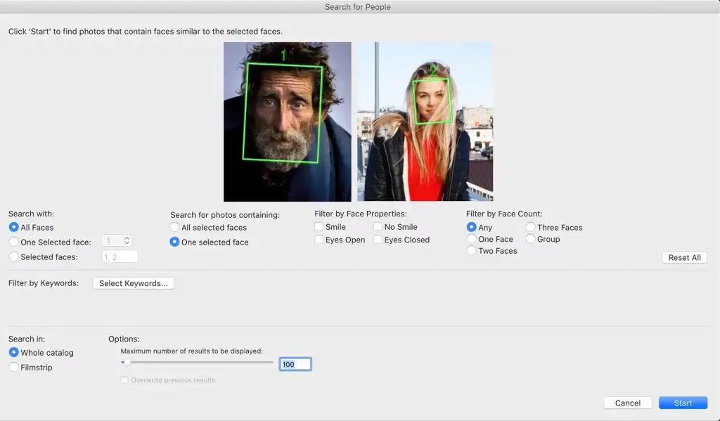 “Search for People” allows you to find photos that show certain persons. Similar to our similarity search, you can select one or more photos and choose the relevant face of the person whose photos you are looking for.
