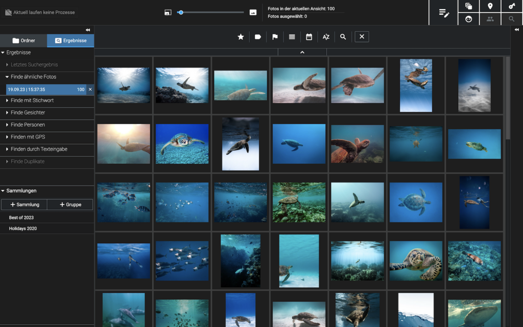 Die Funktion „Ähnliche Fotos finden“ findet Fotos, ohne dabei Stichwörter zu verwenden. Sie wählen einfach ein Referenzfoto aus, das ihrer Suchintention entspricht, und Excire Foto erzeugt automatisch und schnell eine Sammmlung mit ähnlichen Fotos.