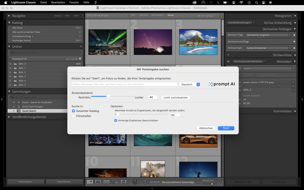 Mittels eines Prompts (Texteingabe) können Fotos mit Inhalten gefunden werden, die von unserer Stichwort-KI nicht erfasst werden. Lightroom Classic Nutzer können mit Excire Search somit jetzt auch nach abstrakten und nicht-gegenständlichen Begriffen suchen (Bibliothek→Zusatzmoduloptionen→Excire Search->“Mit Texteingabe suchen…“). Für die Suche gibt es keine Grenzen mehr und es kann nach unendlich vielen Inhalten gesucht werden. Dazu muss lediglich mit einem Satz beschrieben werden, wonach gesucht wird, wie z.B. „die Oper in Sidney bei Nacht“ oder „Fotos vom Strand mit einer Palme und einem schönen Sonnenuntergang“. Die Eingaben können auf Deutsch oder in Englisch formuliert werden und wie bei den übrigen Suchen auch, kann der Suchraum über die Einstellungen festgelegt werden. Die Ergebnisqualität hängt von geschicktem „prompt-engineering“ und dem gegebenen Bildbestand ab.